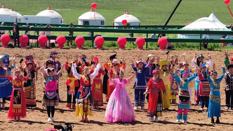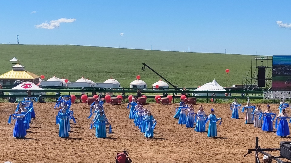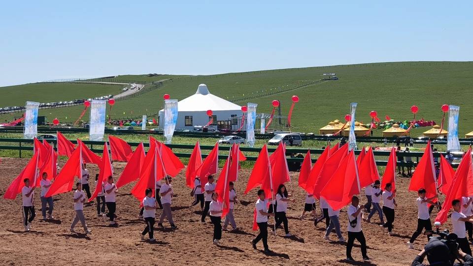 伴着悠扬的歌声,踏着激昂的步伐,在旗帜方队的引领下,哈达方队、民族方队、乌兰牧骑方队、牧马人方队、裁判员及运动员方队依次走进会场。随着彩烟燃放,气球升空,那达慕在梅林组合的歌曲《欢腾那达慕》中拉开帷幕。随后,歌伴舞《石榴花开》等节目轮番登场,现场观众掌声雷动,让来自全国各地的游客在红石崖高山牧场领略了草原的柔情。