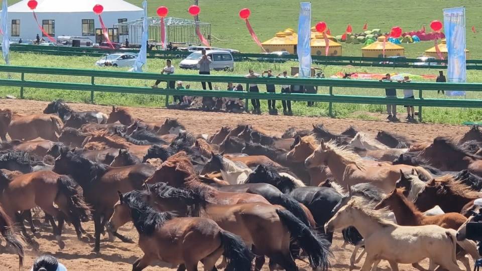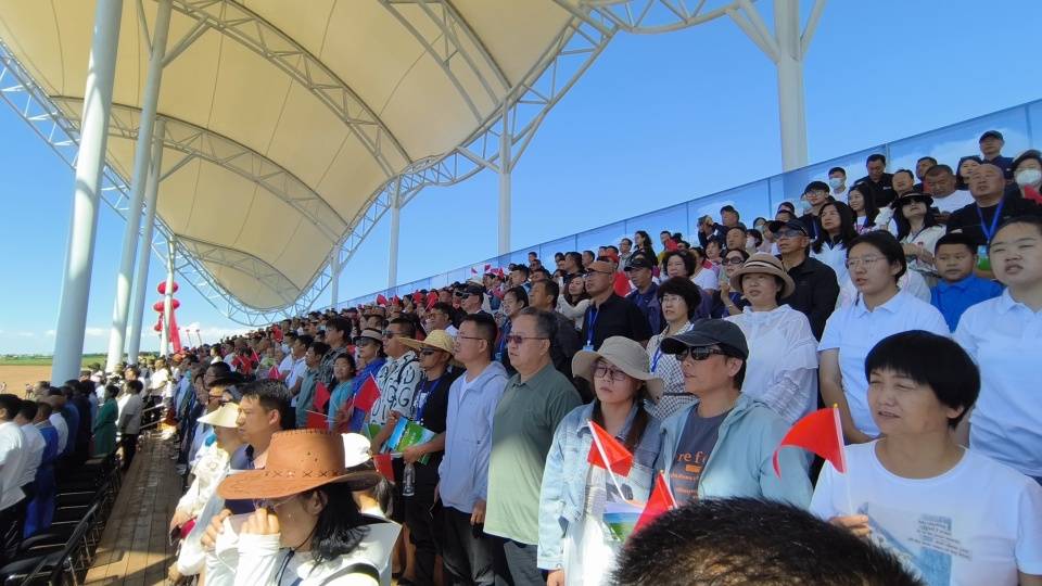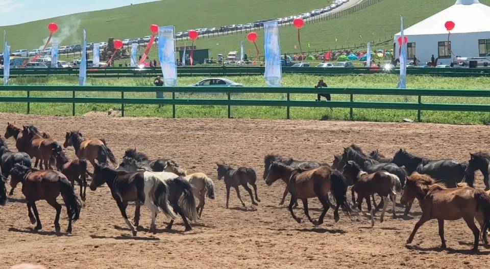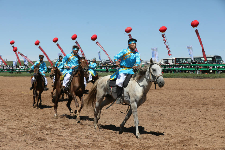 文艺演出结束后,进行了传统的那达慕赛事项目。赛马场上群马奔腾、尘土飞扬,场面蔚为壮观,骑手们扬鞭策马,展现出精湛的骑术,赢得观众阵阵欢呼。摔跤场上,搏克手你来我往互不相让,斗智斗勇……