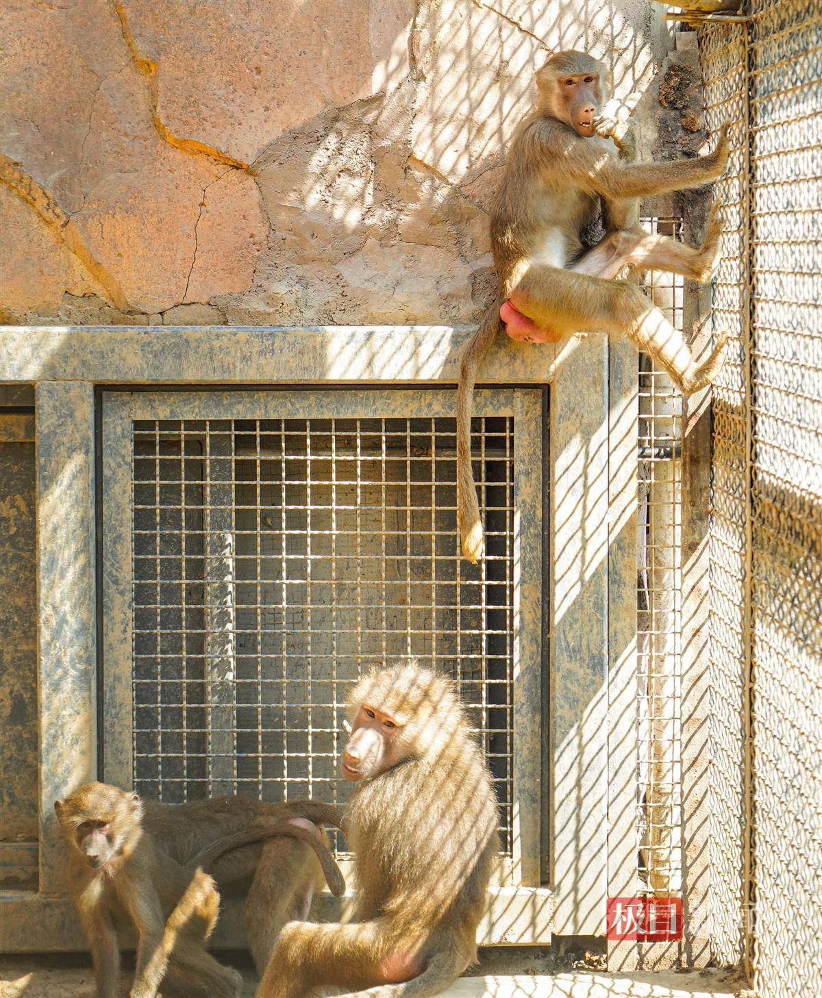 从科普墙上,一眼就能看清成年阿拉伯狒狒雄雌有别,雄性似披着银白色斗篷,雌性毛发棕色。