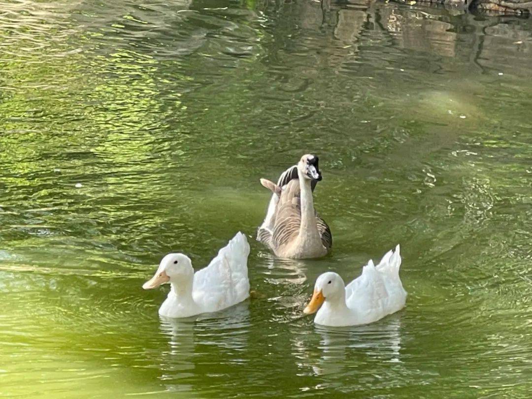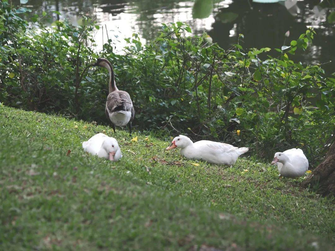 鹅和鸭子们感受到大家的喜爱,慢慢适应了待在岸边,甚至赖着不走,甘愿当“旱鸭子”了。