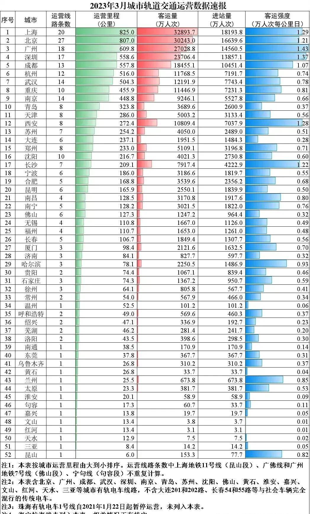 先来看看3月份的城市轨道交通数据:西安以运营里程排名第12名的基础,客运量达到了全国第9,客流强度排到了第4,足见其“实力”之强。