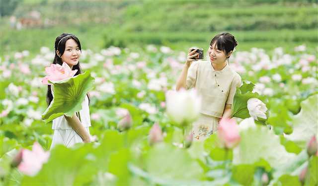 8月2日,云阳县南溪镇青印村荷塘内,游客徜徉其间,赏荷拍照。通讯员 谭启云 周光清 摄/视觉重庆