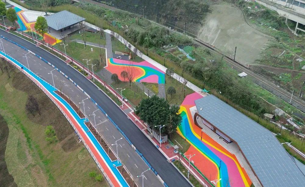 4月6日,大渡口区大滨路滑石滩,功能丰富的节点广场色彩明快。