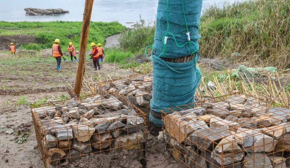 4月6日,大渡口区大滨路万发码头,压树石笼堆放在江滩上的大树周围。
