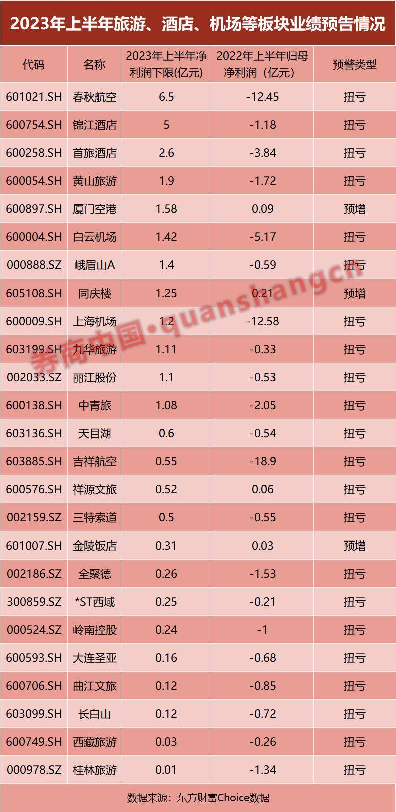 券商中国记者根据东方财富Choice数据梳理发现,2023年上半年,A股共有25家旅游、酒店餐饮、机场等相关板块的上市公司业绩实现预增或扭亏。