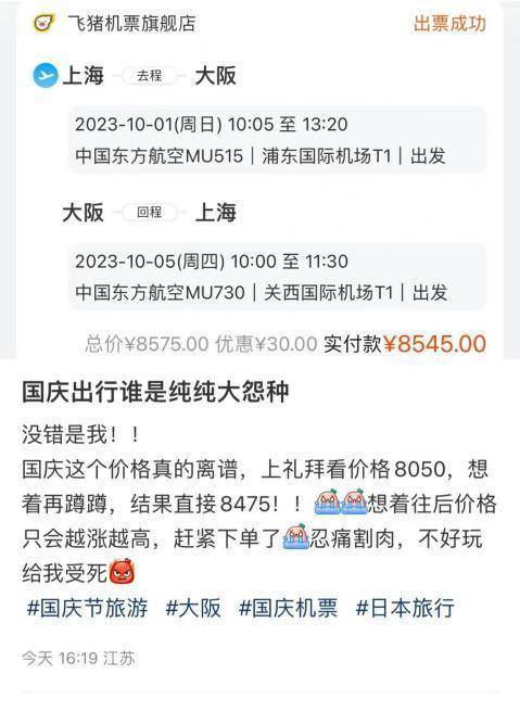 国庆赴日机票往返8000元,网友直呼“冤大头”