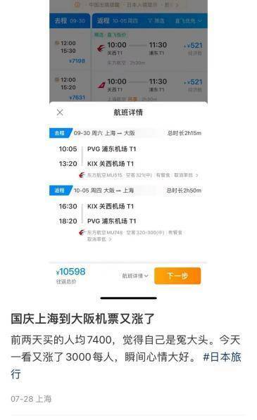 以日本旅游为例,券商中国记者在社交平台上注意到,近期不少网友发帖称,国庆打算去日本,但是机票往返价格高达七八千元,甚至个别日期在10000元以上。