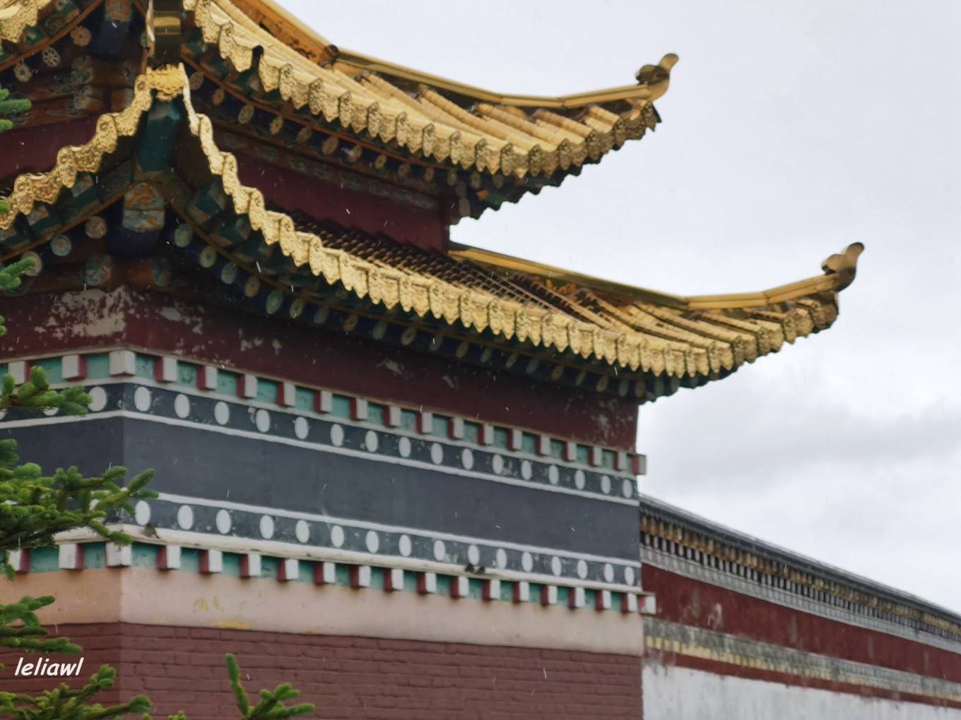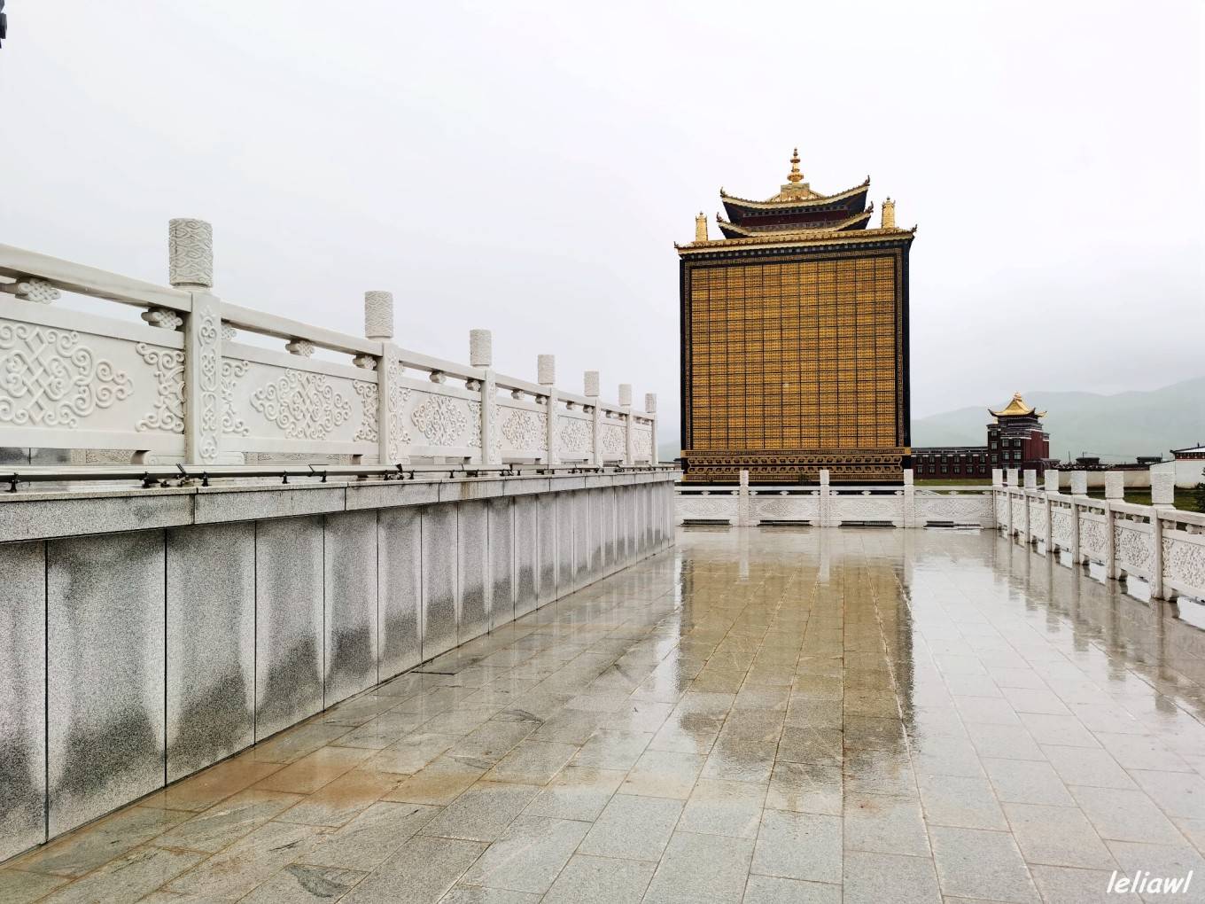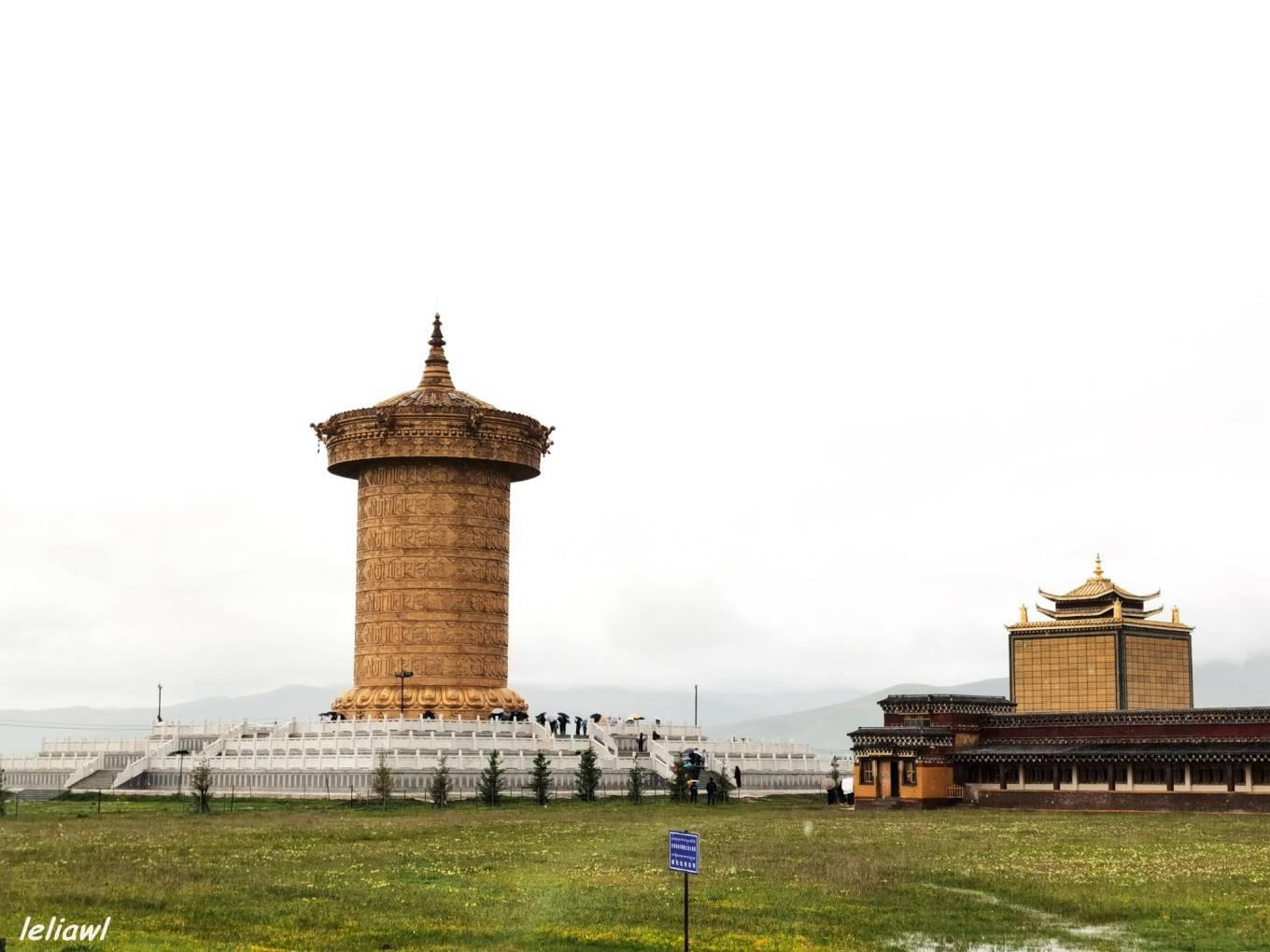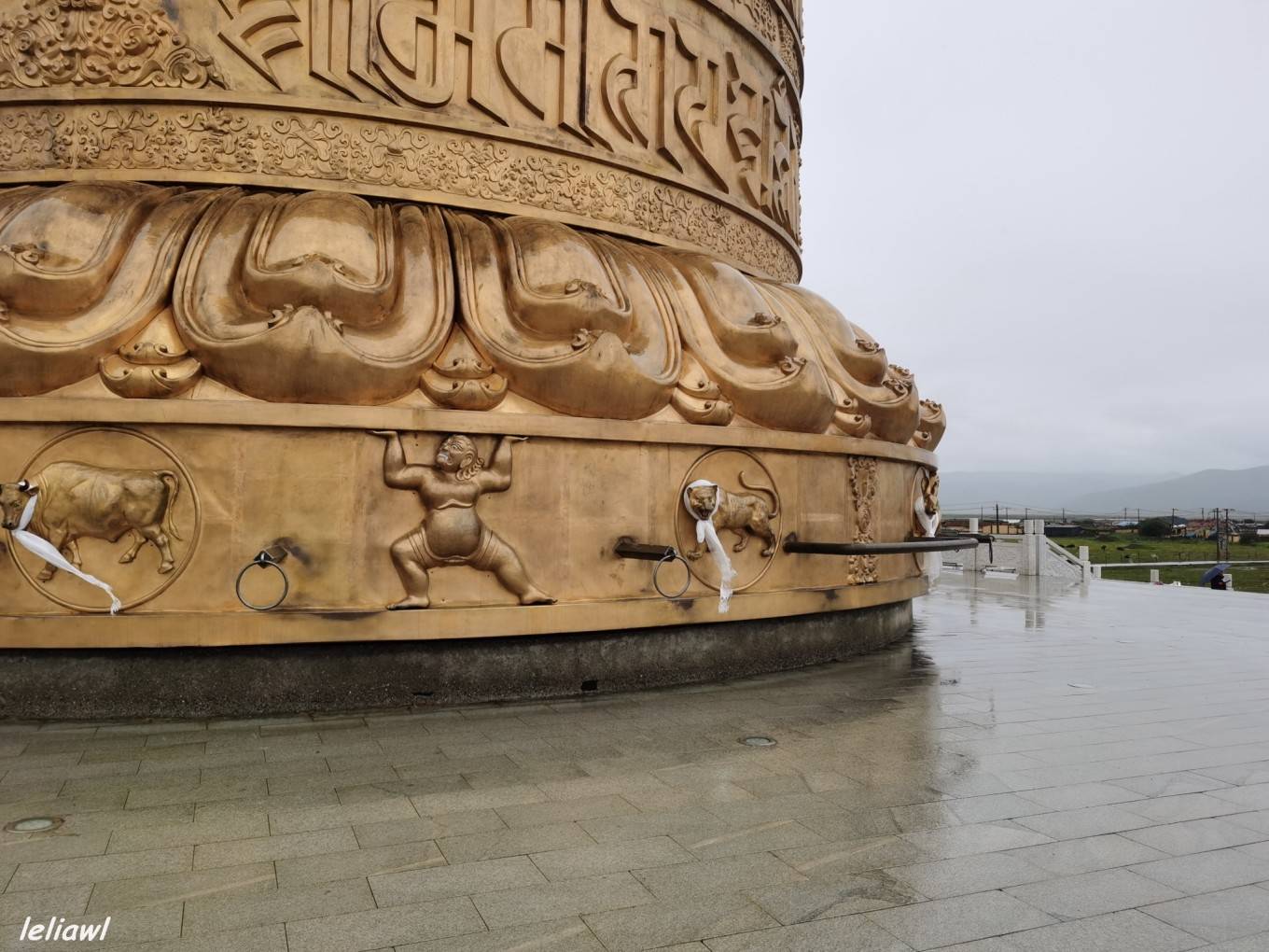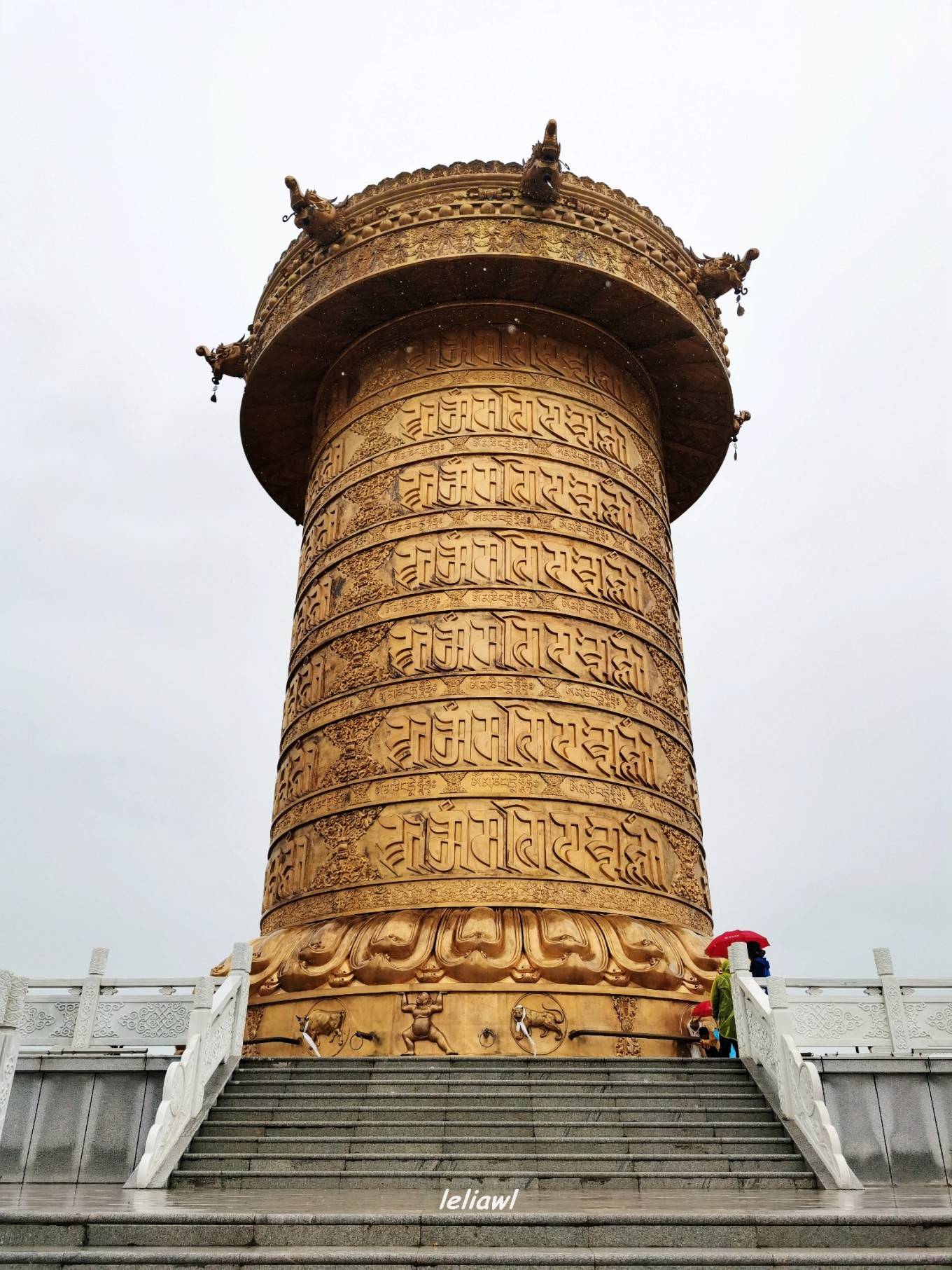 最出名的就是这个巨大的转经筒,娘玛寺大藏经转经筒高约50米,重量约300吨,转经筒筒身部分为钛金制作,外部镶嵌浮雕佛像,花纹贴纯黄金金箔1160㎡,内部藏有经书约11万册。