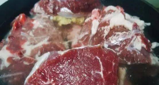 5. 然后将腌制好的牛肉取出来,和冷水一起下锅,放入姜片,开大火将牛肉焯水断生。