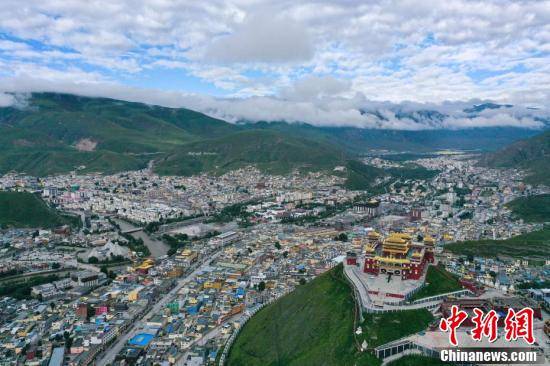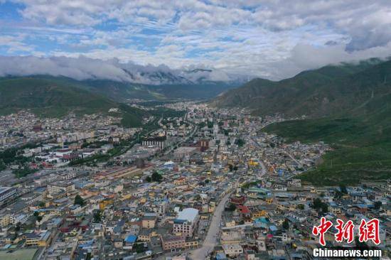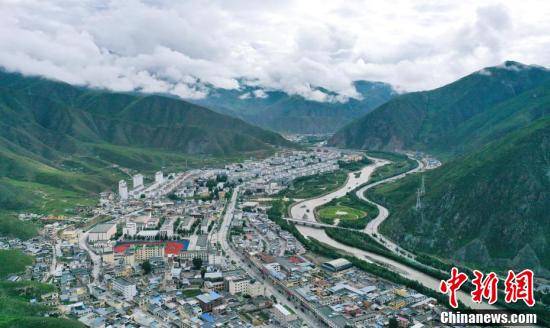 8月4日,航拍青海省玉树藏族自治州玉树市城区。玉树州是长江、黄河、澜沧江的重要发源地。从依山而建的结古寺俯瞰玉树城区,群山披翠,河水穿城而过,各色藏式小楼错落有致,尽显生机。马铭言 摄