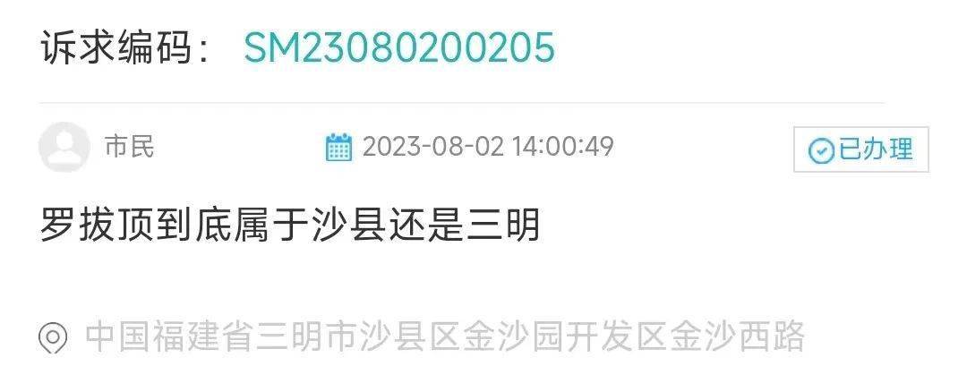 您好,我镇于2023年8月2日收到三明市12345便民服务中心批转来的编号为: SM23080200205诉求件。现将情况反馈如下: ???? 锣顶位于福建省沙县和三明交界处东南的大洛镇境内,距三明市区38公里,海拔1537米。据了解,锣拔顶以前往宝山村的路为分界线,靠近电视塔的一方属于三明,靠近驻军地属于沙县区。锣拔顶本身属于沙县区感谢您对大洛镇的关心与支持,也希望您能一如既往关心支持大洛镇的各项事业!