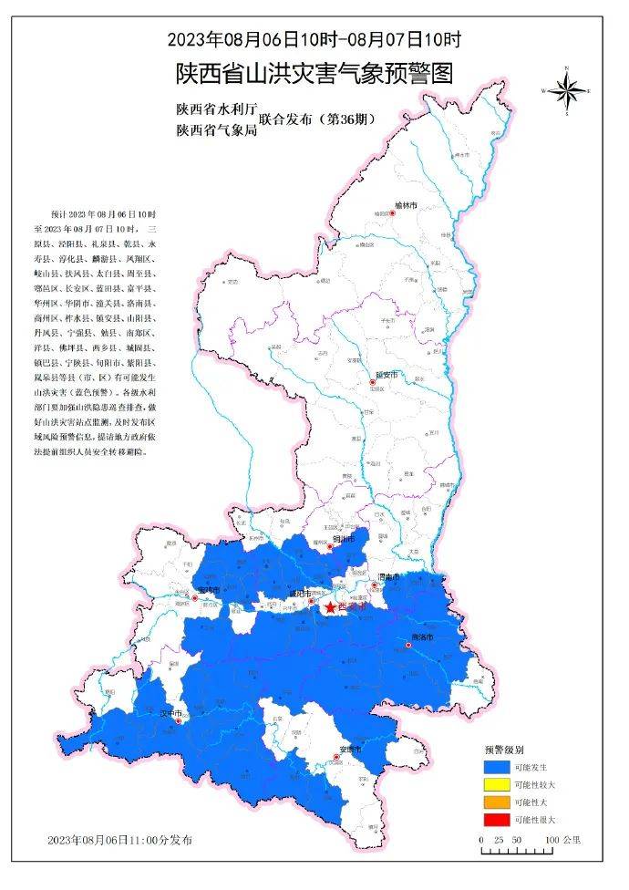 陕西省自然资源厅与陕西省气象局联合发布地质灾害气象预报预警:预计2023年8月6日11时至8月7日11时,延安黄陵、洛川、黄龙,铜川宜君、耀州,咸阳长武、彬州、旬邑、永寿、淳化、乾县、礼泉、泾阳、三原,宝鸡陈仓、渭滨、金台、陇县、千阳、凤翔、麟游、岐山、扶风、太白,西安长安、蓝田、鄠邑,渭南华州、华阴,汉中略阳、宁强、勉县、南郑、城固、洋县、镇巴,安康大部,商洛商州、镇安、柞水、山阳、洛南等部分地区发生滑坡、崩塌、泥石流等地质灾害的可能性较大(黄色预警),请注意及时做好防范。