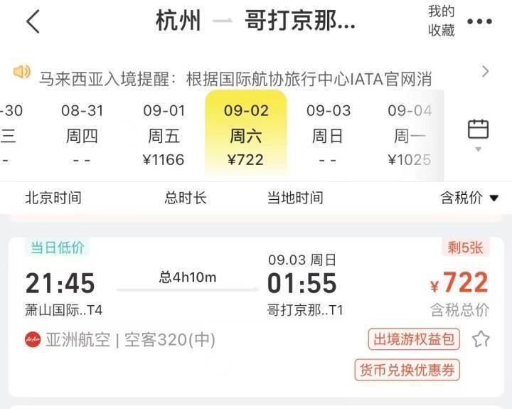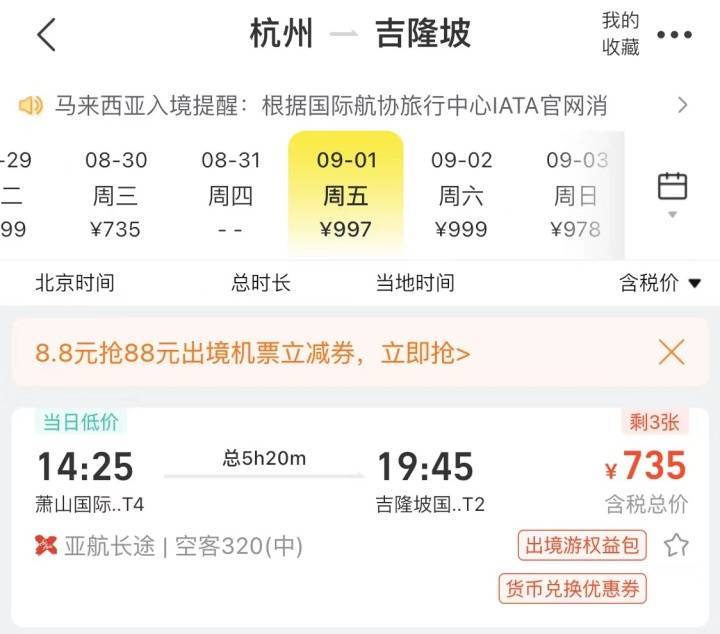 潮新闻记者上网查询发现,9月份伊始,杭州直飞东南亚票价跌破了千元大关,杭州直飞新加坡含税880元,杭州直飞吉隆坡含税735元,杭州直飞曼谷含税981元,杭州直飞沙巴含税722元,杭州直飞清迈805元,已经接近于机票“抄底”价格。尤其是沙巴,9月2日复航,目前往返含税价1500元左右(不含行李托运费用),特别适合想去海岛度假的游客。