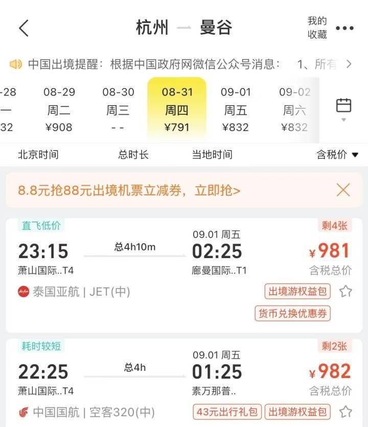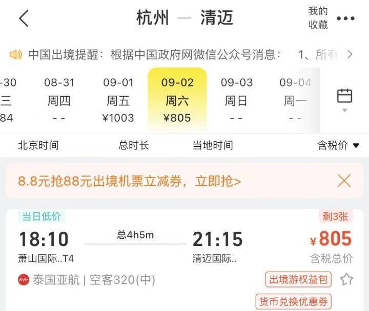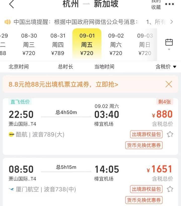 潮记者了解到,目前杭州出发直飞境外,且相对出签比较方便的国家有日本、韩国、马来西亚、泰国、新加坡等亚洲国家,加上九月份杭州即将召开“杭州2022年第19届亚运会”,增加境外航线密度,相对来说,出境机票会跌入小低谷。