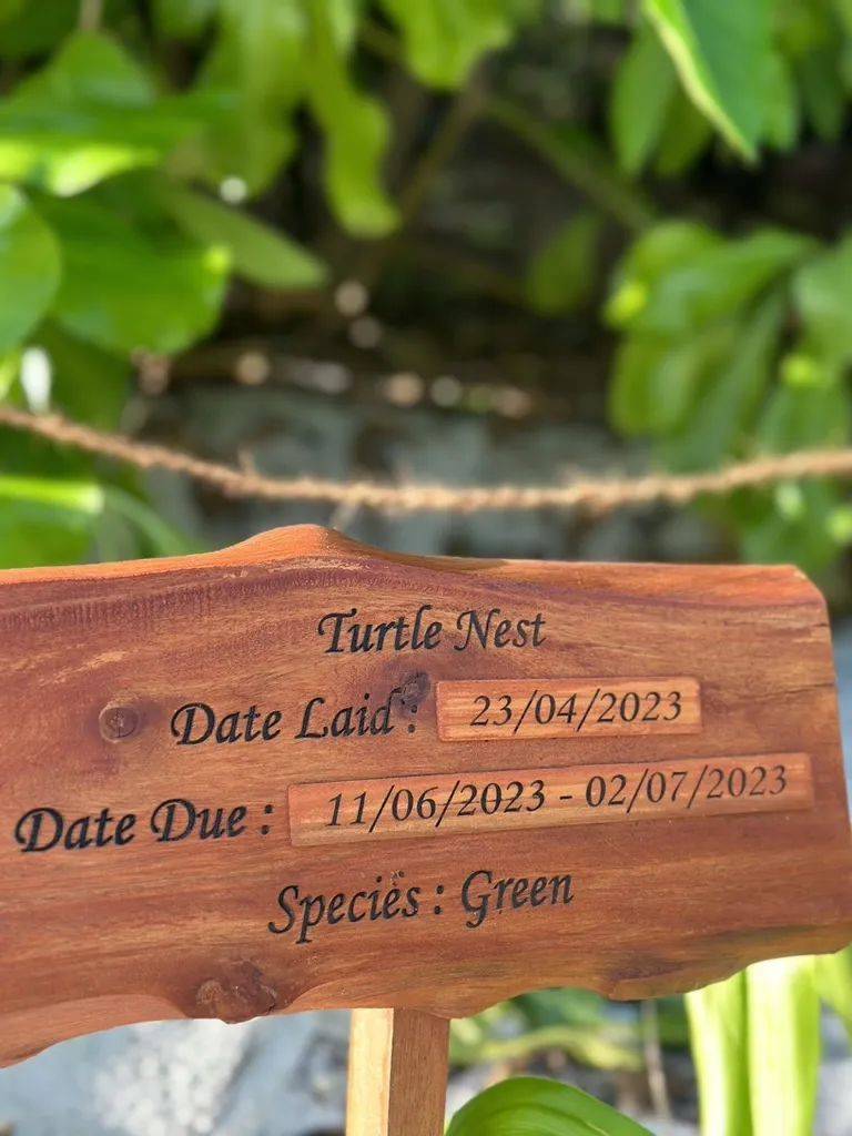 岛上有海洋科学家驻场做研究,给我介绍的是爱尔兰小姑凉,她两年都在岛上,圣诞节也是在岛上过的。她给我挨个介绍海龟在这里下的蛋的位置,酒店把这些地方用棕榈叶围起来,用作保护,像是给海龟的蛋蛋做了个别墅。门口还立了牌子,记录什么海龟,什么时候来下的蛋,预计什么时候孵化破壳。