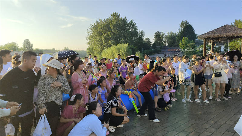 活动现场人潮涌动,热闹异常。游客们激情狂欢,有的提着水桶、有的端着塑料盆、有的拿着水枪,在水中相互泼水、嬉戏,尽情地享受夏日清凉时刻,现场欢声一片。