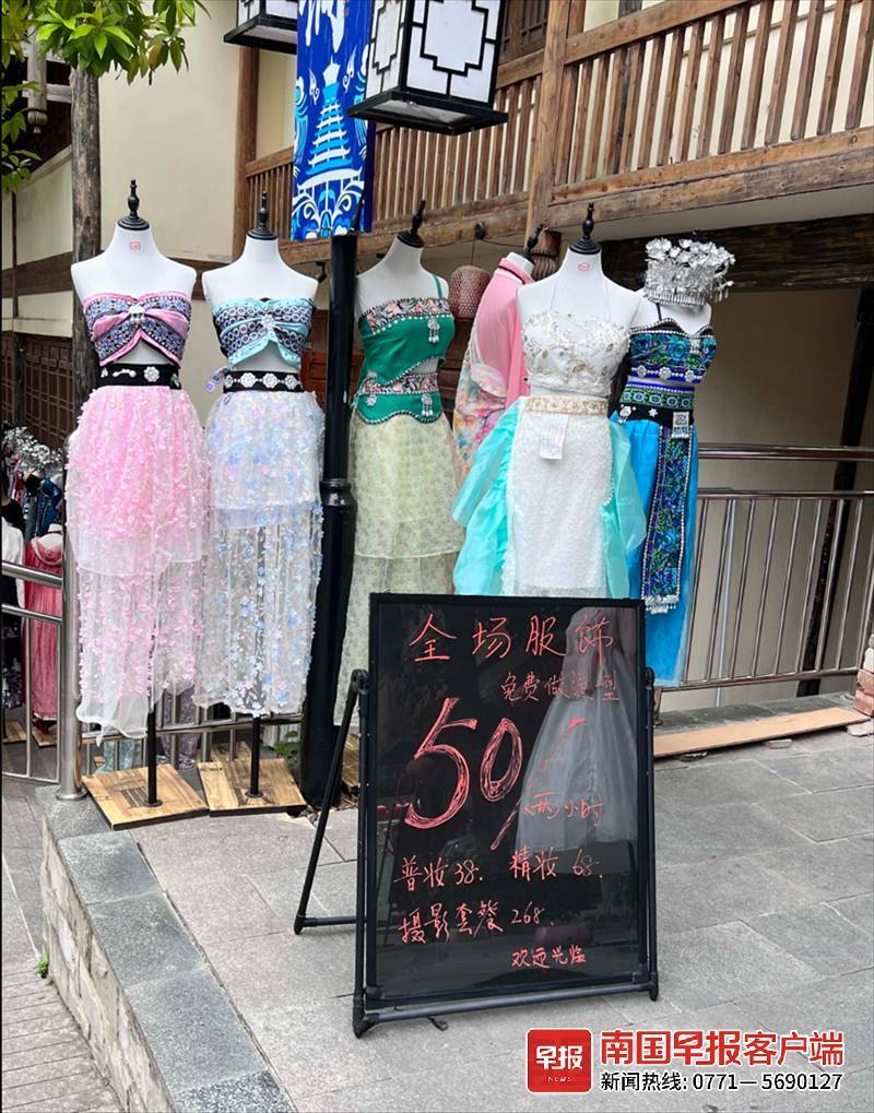 现在,国内不少城市的旅游景点都有类似的服装出租店铺,花上50元就能租到一套漂亮的民族风服装,100多元起就能享受“服装+化妆+拍摄”一条龙服务。