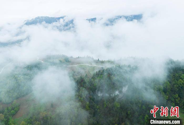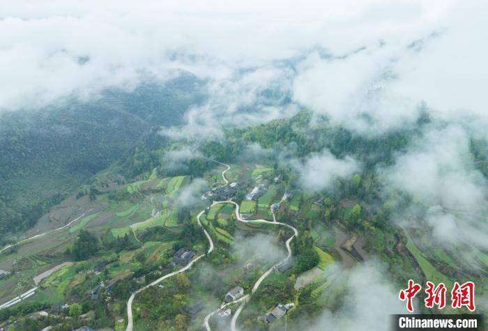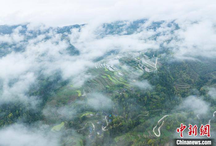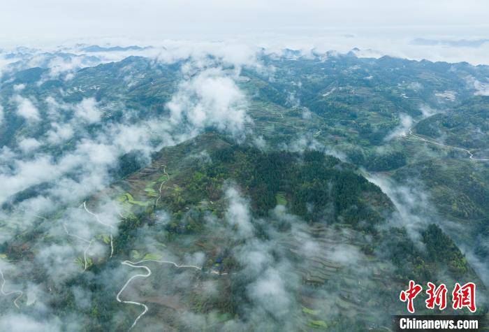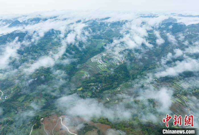 4月7日,贵州省遵义市务川仡佬族苗族自治县都濡街道鹿坪村被平流雾环绕,飘逸的云海层叠相拥,似流动的水墨画卷。