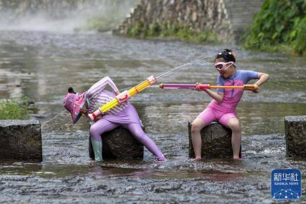 8月5日,在浙江省金华市磐安县安文街道花溪村,两名孩子在嬉水。新华社发(胡肖飞 摄)