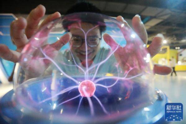 8月6日,在江苏扬州科技馆,小朋友在体验“辉光球”。新华社发(孟德龙 摄)