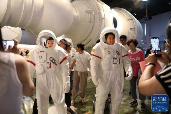 8月6日,小朋友们在位于沈阳市的辽宁省科技馆里航天展区参观留影。新华社记者 姚剑锋 摄