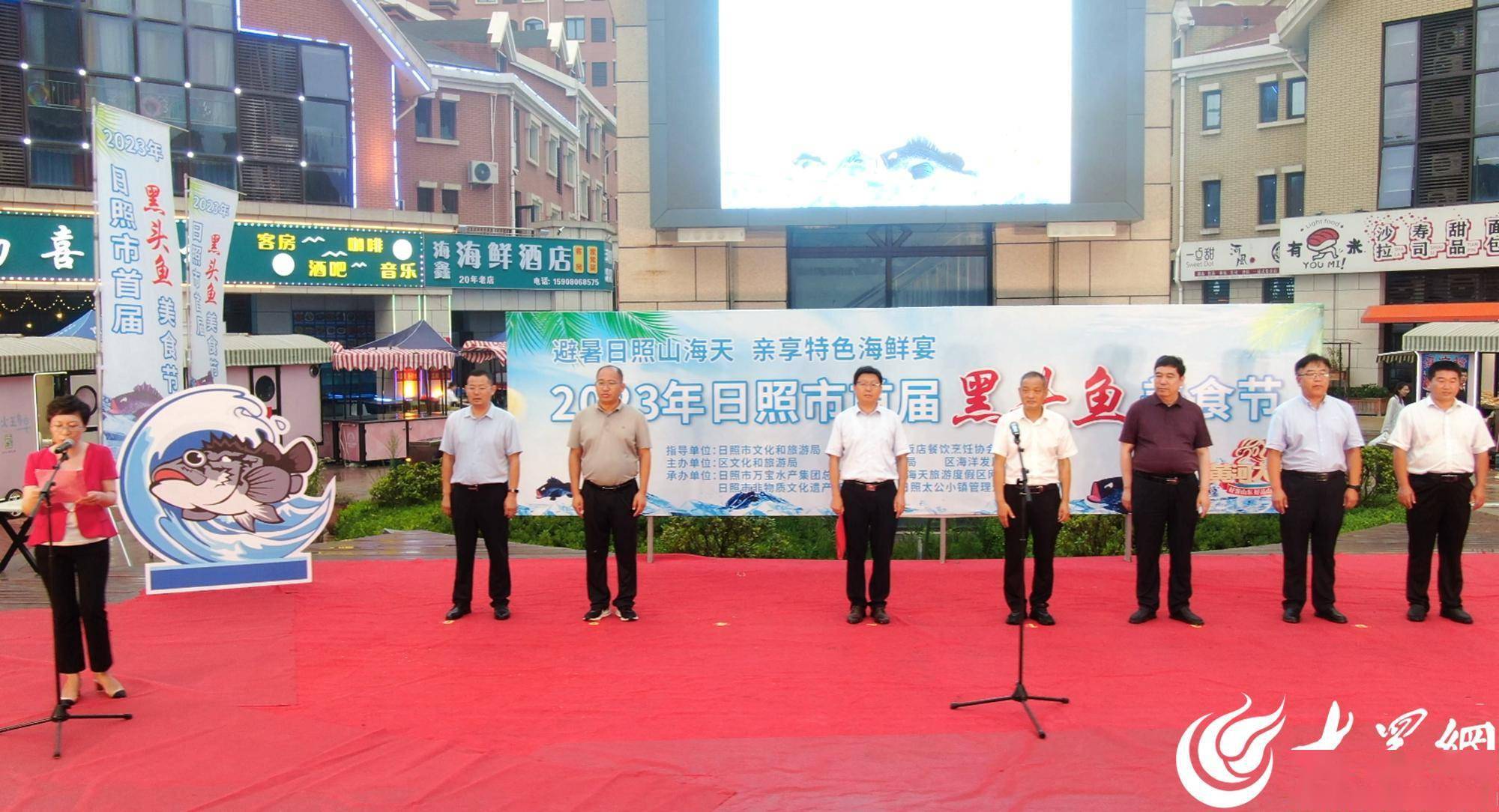 避暑日照山海天,亲享特色海鲜宴。为进一步扩大山海天旅游品牌的知名度和影响力,丰富旅游供给,推动全域旅游发展,更好地宣传推广地理标志产品“日照黑头鱼”和特色海鲜美食的美誉度,8月6日晚,2023年日照市首届黑头鱼美食节在王家皂旅游街区中心广场正式拉开帷幕。精彩的文艺展演、美味的黑头鱼盛宴吸引了众多游客前来观看品尝。本届黑头鱼美食节由日照市文化和旅游局、日照市旅游饭店餐饮烹饪协会指导,山海天农业农村局、海洋发展局、文化和旅游局联合主办,日照市万宝水产集团总公司、日照山海天旅游度假区网箱养殖协会、日照太公小镇管理运营有限公司承办。