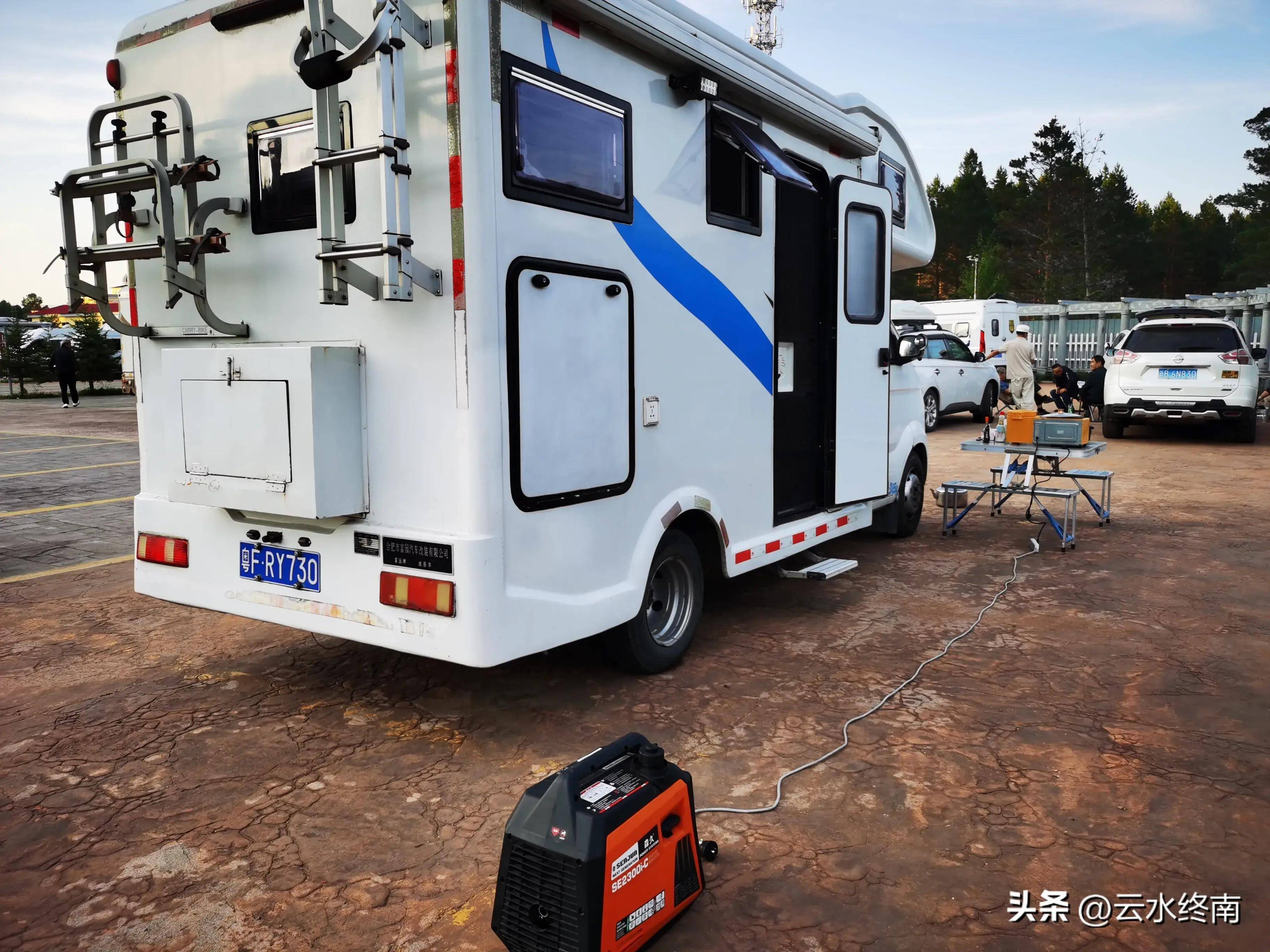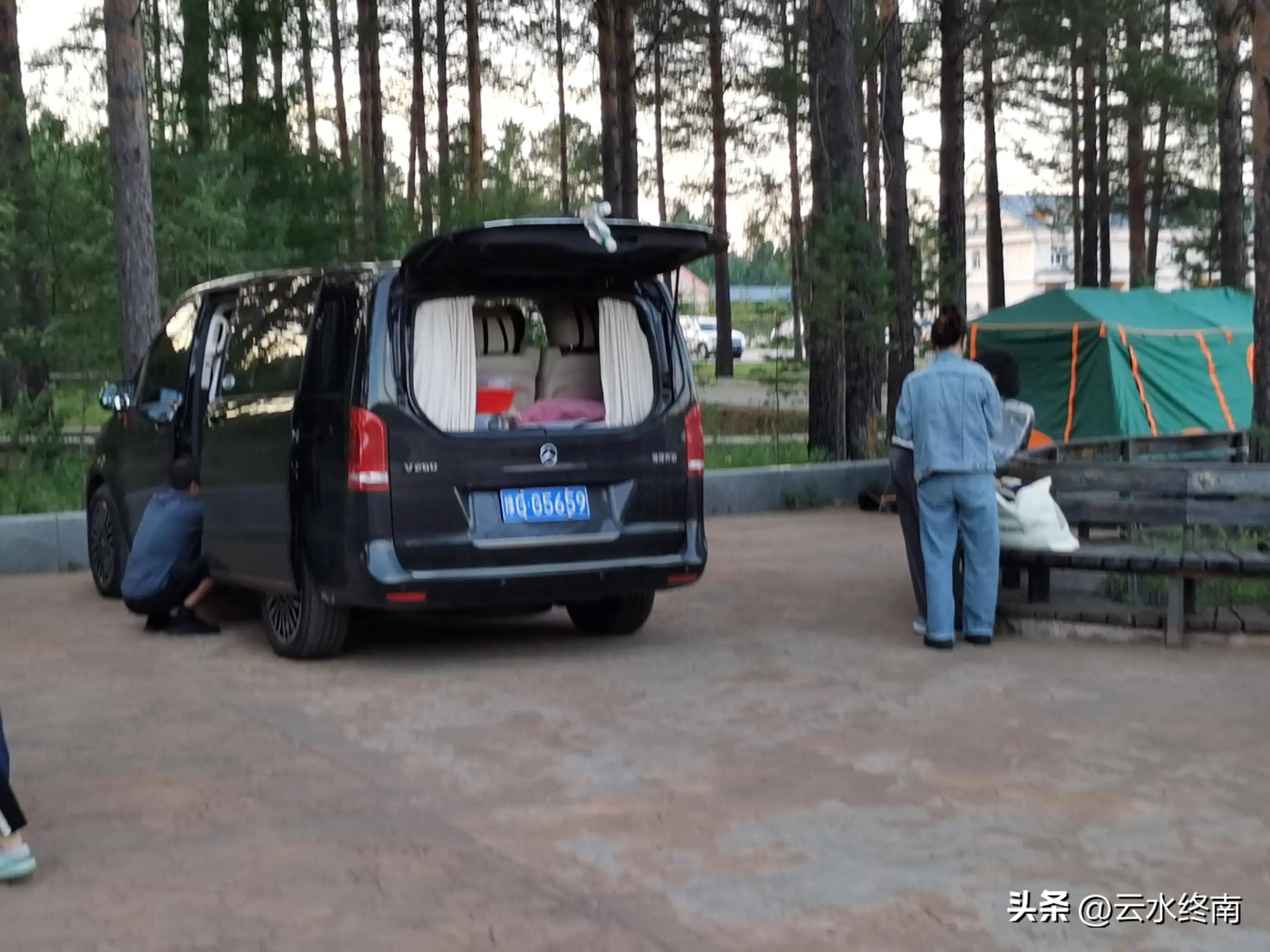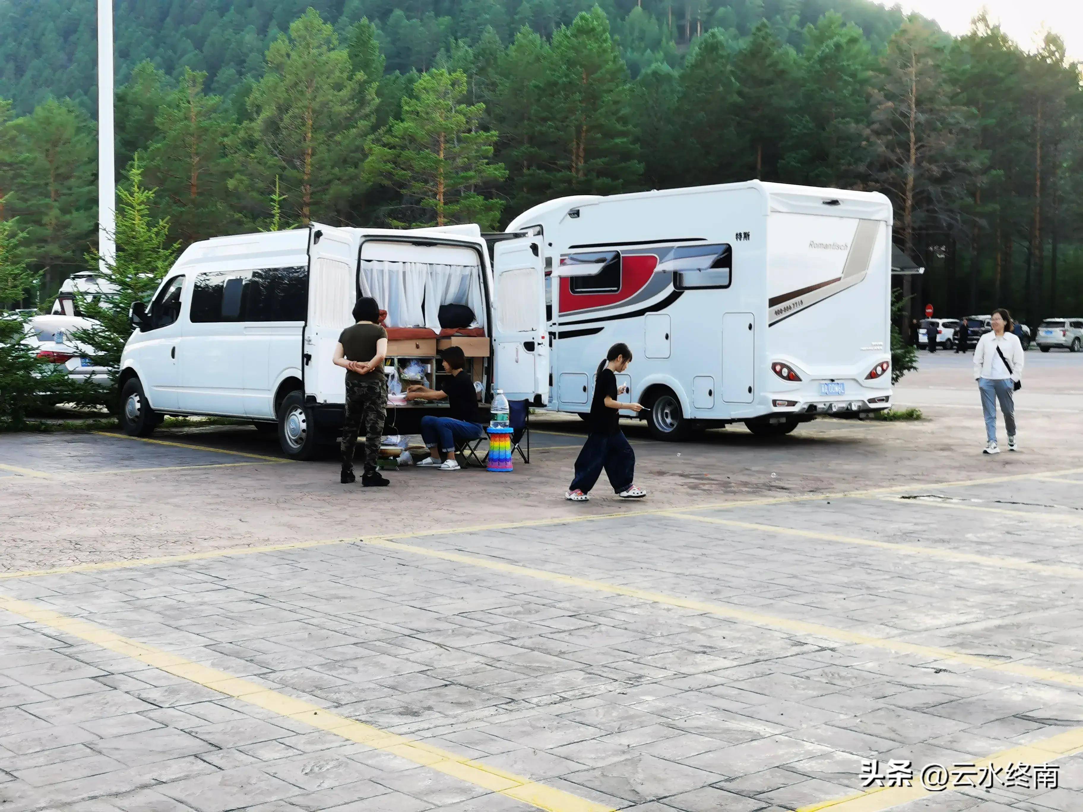 停车场露营的车很多,从房车到床车乃至自行车都有,有上百万的豪车也有几万的普通车。