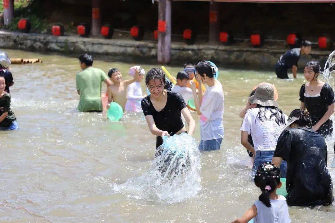 婚礼演绎在祝福和掌声中完结,前来观礼的游客纷纷跳入这条情缘河里嬉水玩闹。他们或拿水枪或拿水盆,不少小朋友还爬上竹筏指挥戏水,河水经大家戏水泼洒,形成一朵朵晶莹的水花洒向想要祝福的人,大家礼尚往来,场景热闹非凡。
