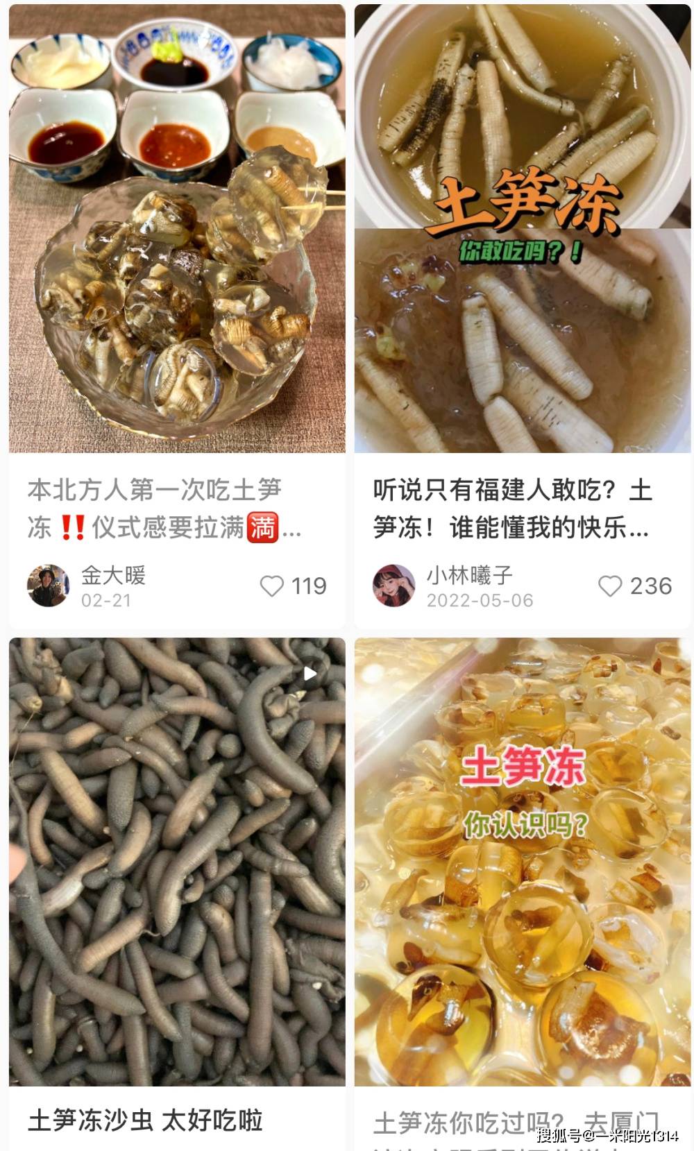 福建人就把虫子和果冻两个看似毫不相关的食物,结合在了一起,福建的土笋冻由海泥虫组成的,口感Q弹呈果冻状,又因营养丰富,有着“动物人参”的美誉。不过还是有很多网友表示“不太清楚土笋冻是什么”“才知道土笋冻是虫子做的”。