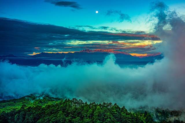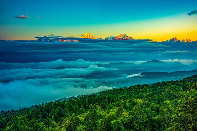 夏日的王岗坪,森林是一片翠绿的海洋。雨后初晴,晨雾在林间缓缓流动,缠绕着每一棵冷云杉,恰似仙女身上长长的飘带。山间流岚,漫过山岗,平铺成茫茫云海,把王岗坪几座山的林海分成了云上云下两个世界。云海流动,波涛起伏。太阳把贡嘎群山染成金色,在洁白的云海和深绿的林海映衬下,显得格外的鲜艳耀眼。每一个亲身经历者无不感叹这大气磅礴的壮美。太阳升起,阳光像一缕缕金色的细沙,穿过层层叠叠的枝叶,洒落在林间,茂密的森林散发着舒心的凉爽。林中的鸟雀在欢快地飞翔着、鸣叫着,伴着潺潺的溪水在微风中缓缓飘散。
