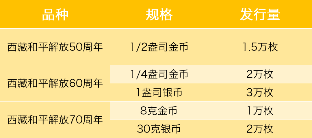 中国人民银行历史上一共发行过3套西藏和平解放金银币,发行量如下: