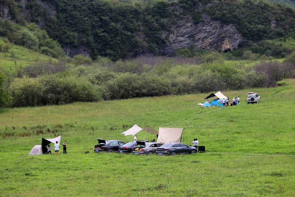 ▲8月6日,巫溪红池坝景区,游客在草场间搭棚露营。