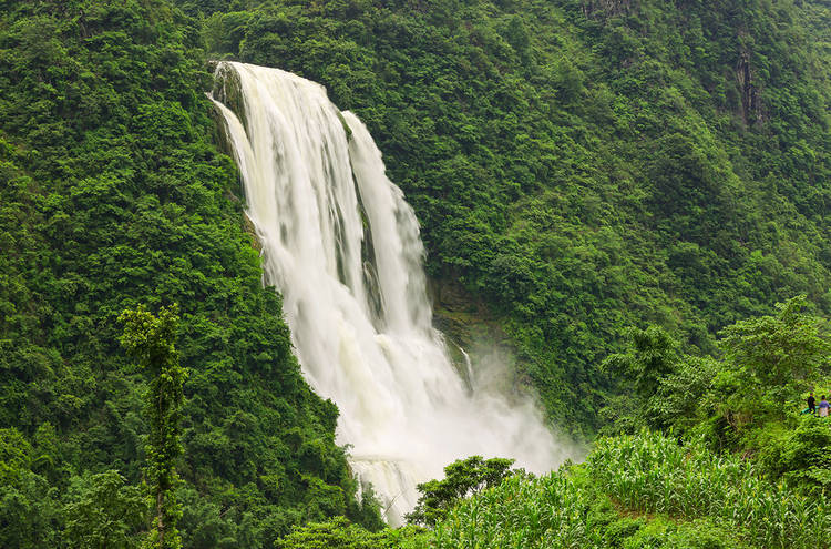 荔波小七孔景区拉雅瀑布,宽10米,高30米,顺山势倾泻而下,水花飞洒,沁人心脾。