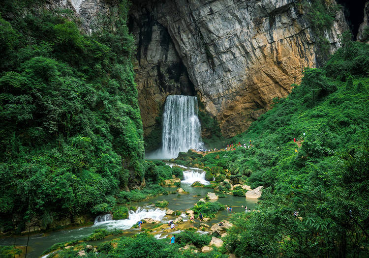 “飞流直下,冲击谷底,激浪滔天。”滴水滩瀑布总高达410米,雄伟磅礴。
