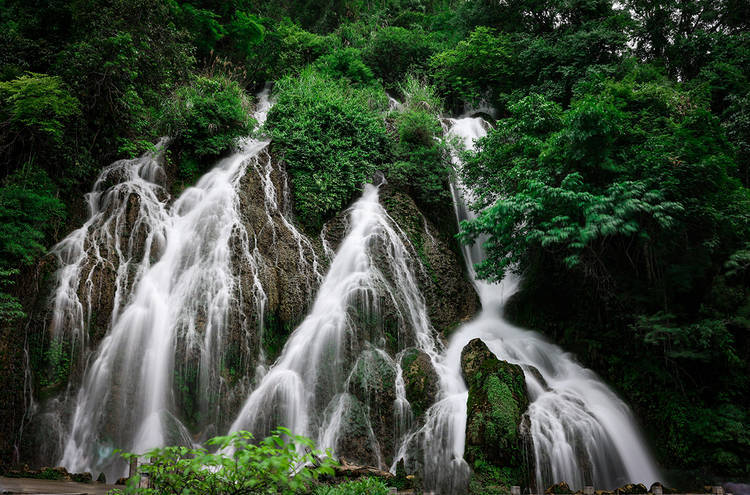 赤水四洞沟瀑布群在山溪间排列着四级跌水瀑布,形态各异。