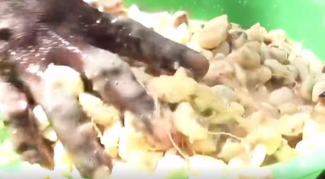 随后,女人们熟练地制作着午餐,她们将果子敲碎。拿出了里面的果肉。再将它们和早上抬回家的泥水混合抓拌均匀,连加热都不用,更别说放调味料了。