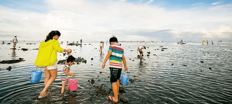 等潮水退去,赶海好时机,各种贝类、螃蟹,正在等待你的召唤,快带上你的小铲子来吧。