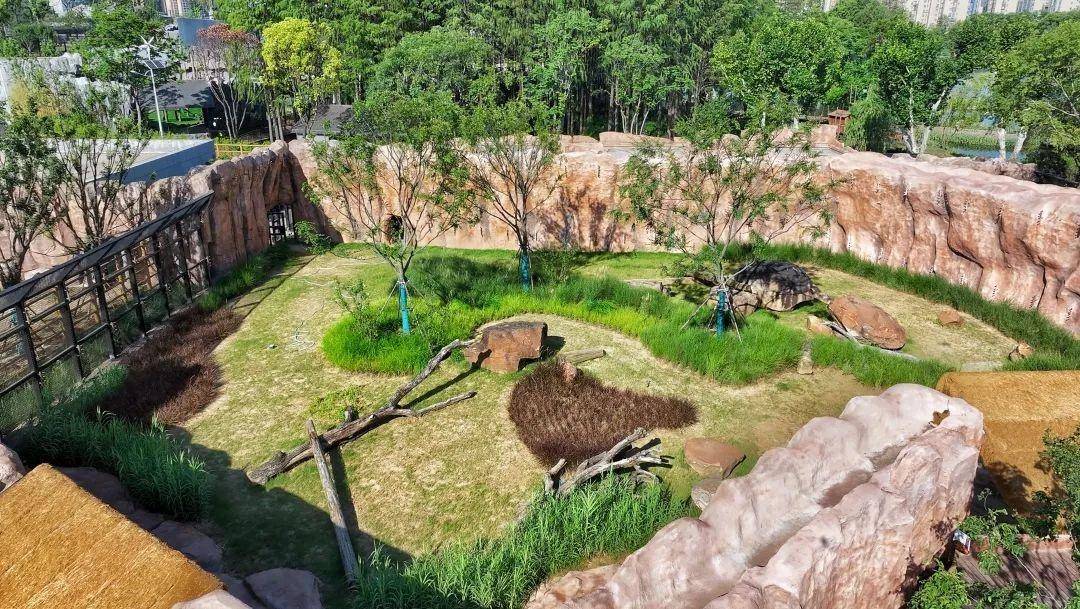 整个场馆分为外场和内场。由黄色岩石造型墙壁垒砌而成的外场,共有818平方米,草地繁茂,树木和石块组合而成的攀爬架分布其中,为狒狒们模拟出干燥的草原风貌。