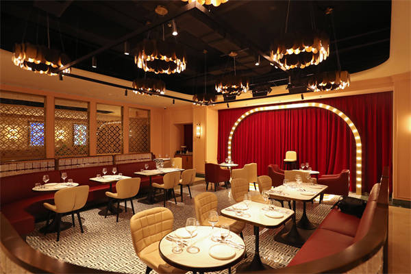时间退回到30分钟前,在静安区江宁路的MOHO商场地下一层,一家看起来“普通”现代花园餐厅门前,四道热情奔放的东南亚推荐菜之外,还特别提示说,购买电影票堂食点餐可享受88折,多少令人狐疑,“看电影,还是吃饭?还是一起?”穿过新鲜的绿植和白色的餐椅,与这家南洋餐厅告别,上世纪30年代纽约装饰艺术的繁华摩登便扑面而来,迎面还有三台电影取票机。取好电影票,路过点餐窗口,点上了刚刚一眼相中的酸汤鲈鱼和炭烧猪颈肉,穿过走廊区,犹如穿过了一条时光隧道,尽头是一家复古风格餐厅,皮质的考究沙发、木质的长长吧台,还有红丝绒的小舞台幕布。