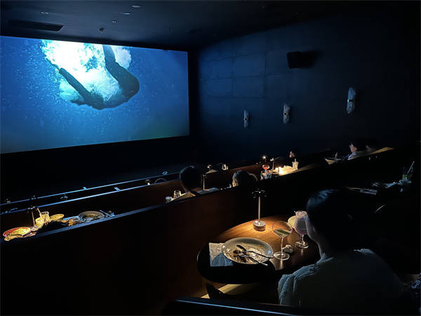 穿着得体的服务员,欠着身子,送上来自两家不同餐厅的菜品和酒水;舒适的双人沙发前摆放着椭圆形的木桌,上面有一盏小小的台灯,点亮台灯,忍不住给精致的菜品拍下照片;还有宽大的银幕、环绕的音响和暑期档热映的电影……曾经,可乐冰激凌爆米花,就是我们对“边看边吃”的想象;如今,上海有了全国第一家可以一边吃正餐品美酒,一边欣赏电影的佰映三克映画电影院。