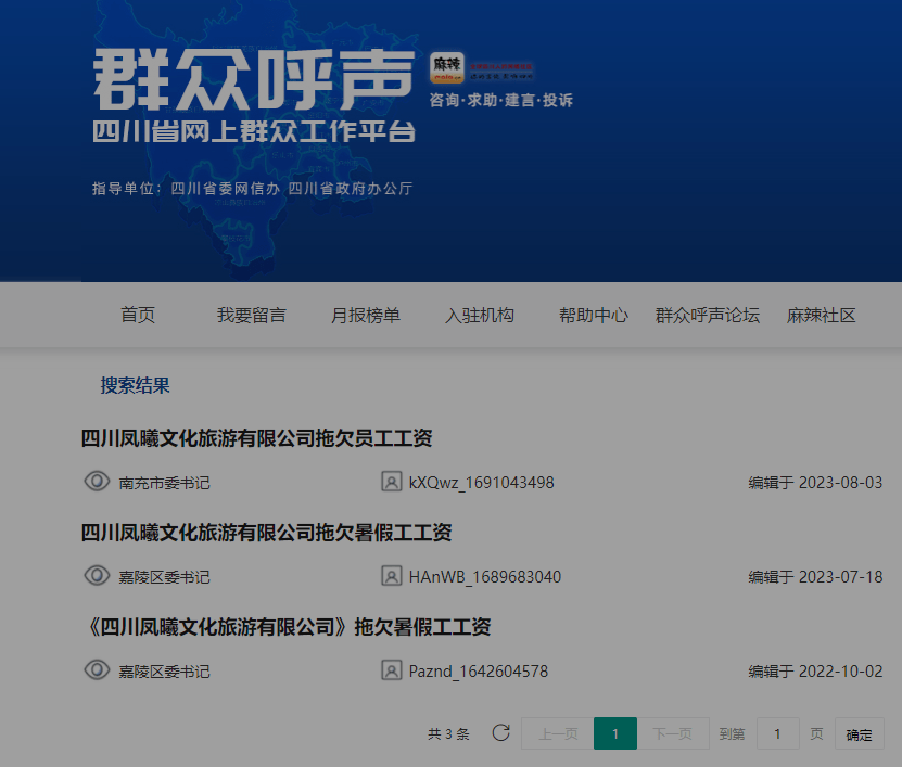 在群众呼声板块,也能看到网帖反映,四川凤曦文化旅游有限公司疑似拖欠打工者薪水的内容!真是不知这家公司怎么了?是何道理呢?