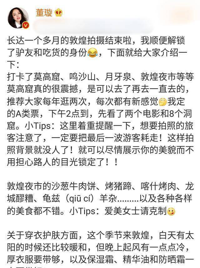从她发布的文字中可以得知照片是她在敦煌拍戏的时候拍摄的,在敦煌拍戏条件艰苦,敦煌昼夜温差大,但是作为演员的她非常敬业的圆满完成了拍摄,并且忙里偷闲给网友分享旅游心得。