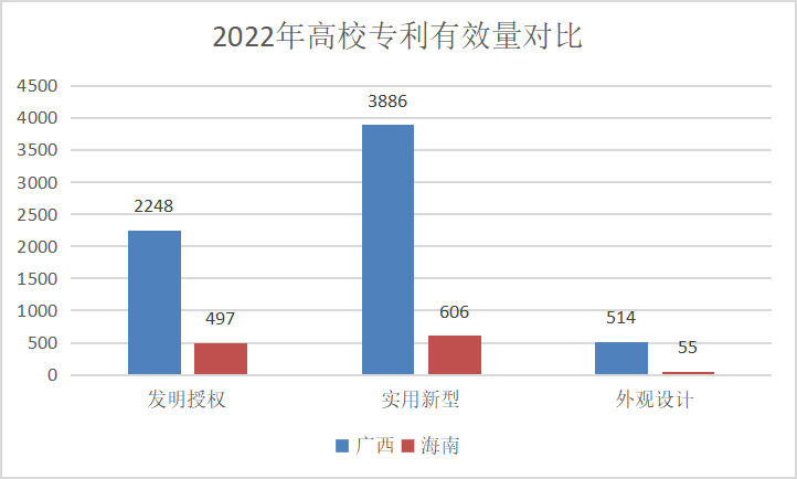 知识产权能够促进经济转型升级。随着全球经济一体化的深入发展,越来越多的国家和地区开始重视知识产权保护,以实现经济的转型升级。对于落后地区来说,通过加强知识产权保护,可以吸引更多的创新资源,推动产业结构调整和升级,从而实现经济的可持续发展。从2022年高校专利有效量可以看出,海南的高校专利有效量远远的高出广西。综合来看就算是广西的增速较慢,但是海南想要超越广西还是需要很长一段时间才行。