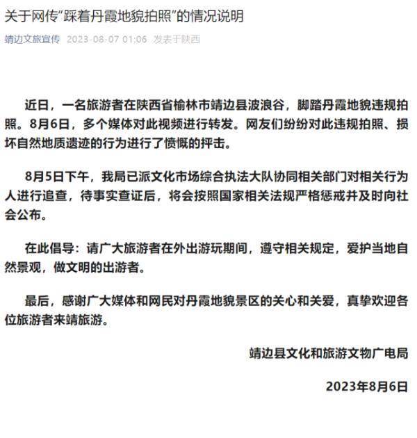 据“靖边文旅宣传”7日凌晨消息,陕西榆林靖边县文化和旅游文物广电局发布“关于网传“踩着丹霞地貌拍照”的情况说明”: