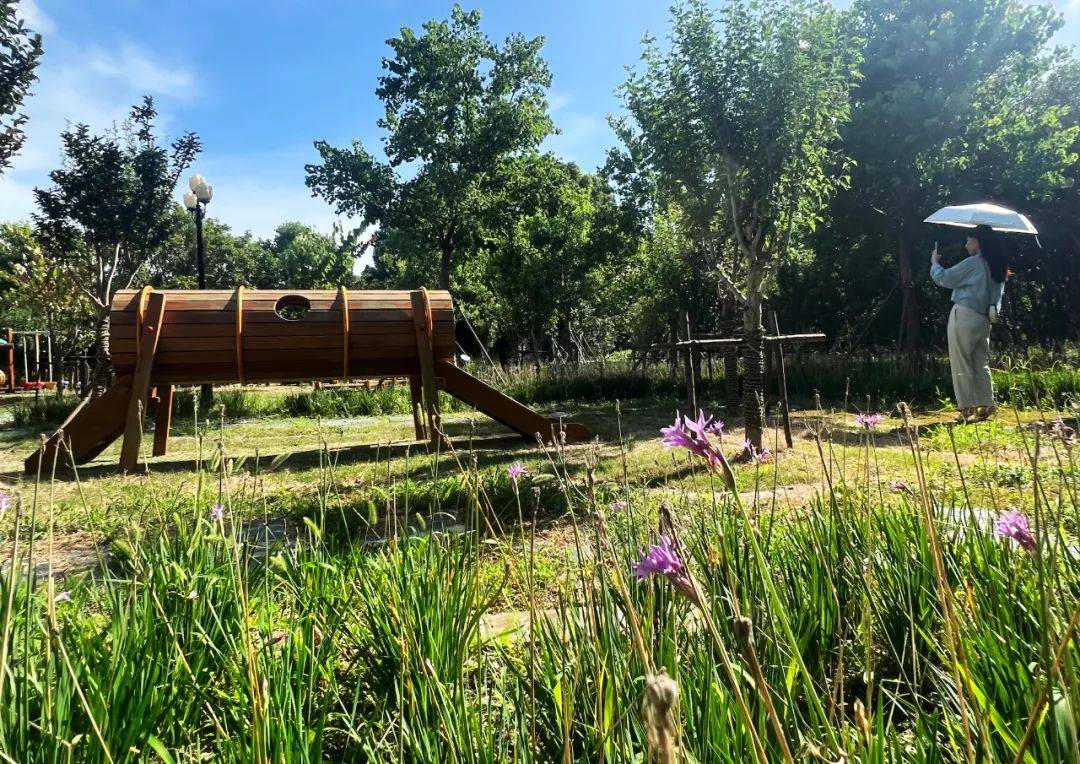 不仅有森林,也有游玩所需的配套设施。海岸君看到,林地中建设了避雨亭廊、休闲座椅等,还配上了摄像头和路灯,并建有一片能容纳上百辆私家车的林下停车场。距林子不远处,还有两家民宿,院子内的树屋很受孩子欢迎。周边则有大片的草坪与开阔的玉兰湖,无论是住宿、露营还是玩桨板等水上运动,你都能找到感受野趣的方式。
