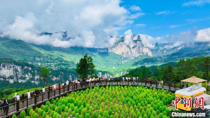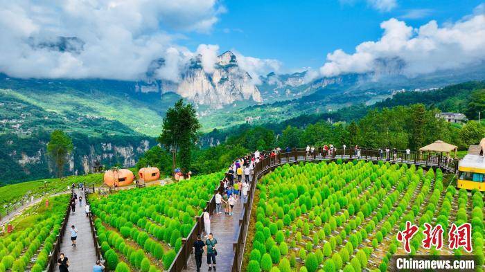 近日,在湖北省恩施土家族苗族自治州恩施市屯堡乡马者村,蓝天白云,青山叠嶂,吸引众多游客前来拍照“打卡”。近年来,恩施市高山地区依托独特的“清凉资源”,积极打造“凉+农业”“凉+研学”“凉+康养”等多方位融合、多业态互补的避暑康养产业链,有效带动产业和乡村发展。