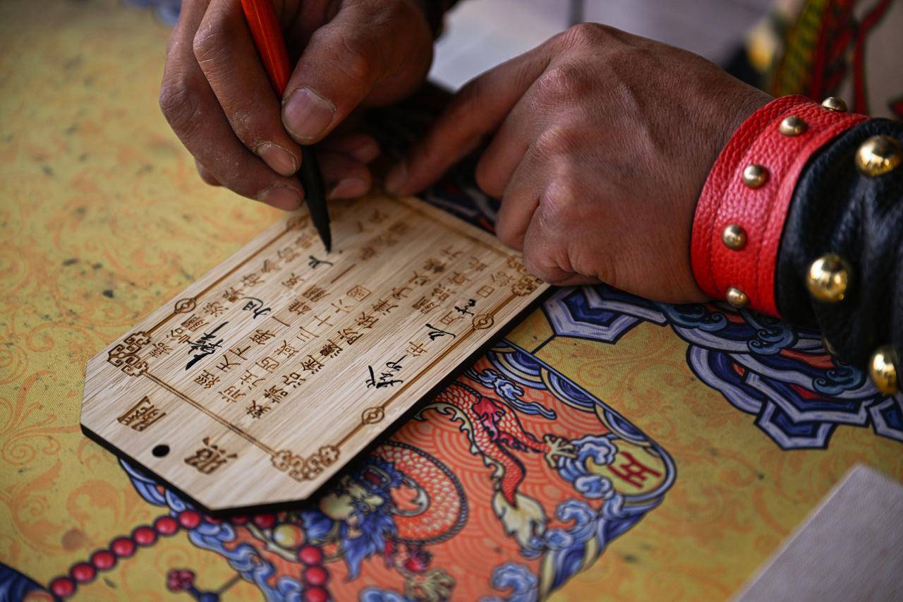 李森在为游客手写“关照”(7月14日摄)。组图均由新华每日电讯记者陈钟昊 摄