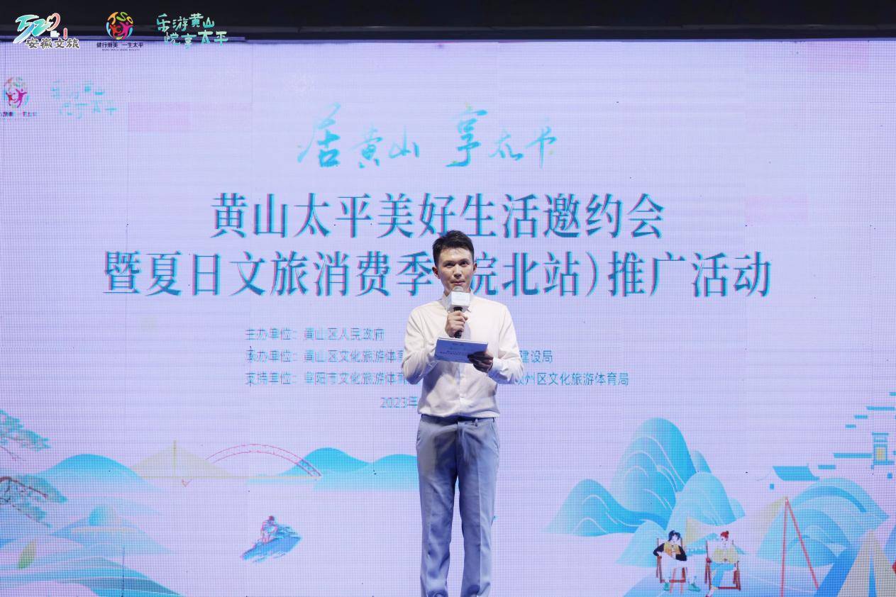 8月4日,由黄山区人民政府主办,黄山区文旅体局和住建局承办的“居黄山 享太平”黄山太平美好生活邀约会暨夏日文旅消费季(皖北站)推广活动在阜阳成功举办。阜阳市文化旅游体育局副局长张金波,黄山区委常委、副区长洪伟安,阜阳市颍州区人民政府副区长王璐,阜阳市颍州区文化旅游体育局副局长任锋出席活动。阜阳市百余家重点旅行商、当地企业和新闻媒体代表受邀参加,活动吸引了众多阜阳市民现场参与。