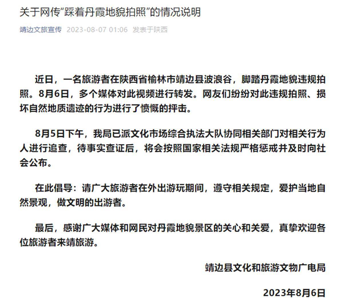 8月7日凌晨,靖边县文化和旅游文物广电局就此事发布通报。