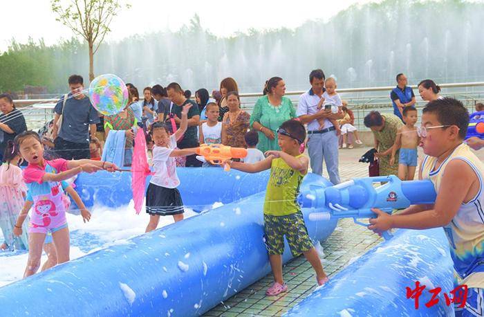 2023年8月6日,小朋友正在克拉玛依河中心景区展开“泡沫大战”。